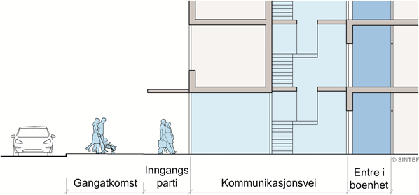 Figuren viser skillet mellom utendørs gangatkomst, inngangsparti, innendørs kommunikasjonsvei og privat entré i boligblokk. Anvisningens beskrivelse av entré gjelder også for småhus og svalgangsbygninger som har atkomst direkte fra det fri. I svalgangsbygninger regnes svalganger som kommunikasjonsvei. Utendørs gangatkomst og inngangsparti er omtalt i Planlegging 323.101.