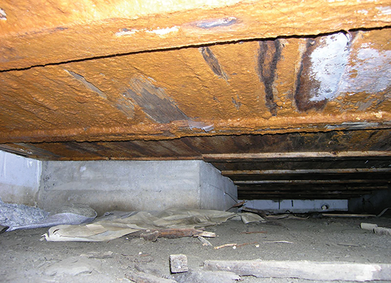 Råteskader i bjelkelag og stubbeloftsbord mot kryperom