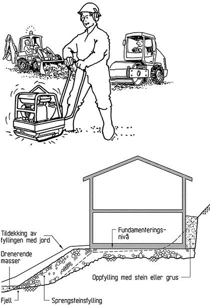 Fundamentering på sprengsteinsfylling er en rasjonell fundamenteringsmåte i fjellterreng, spesielt hvis en følger prinsippene om lett kommunalteknikk i [521]. Det er viktig å planlegge arbeidet slik at man kan utnytte massene på stedet med minst mulig håndtering, mellomlagring og transport, og legge grunne, tekniske ledningsanlegg under husrekkene m.v.