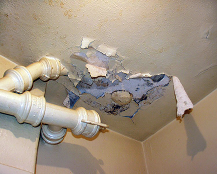 Undersiden av en etasjeskiller der badekaret er tatt ut og man har begynt å dusje rett på golvet. Foto: SINTEF Byggforsk