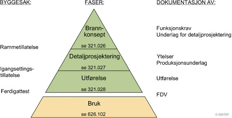 Figuren gir en oversikt over faser i byggeprosjektet som krever dokumentasjon av brannsikkerhet, og henviser til anvisninger der fasene omtales nærmere.