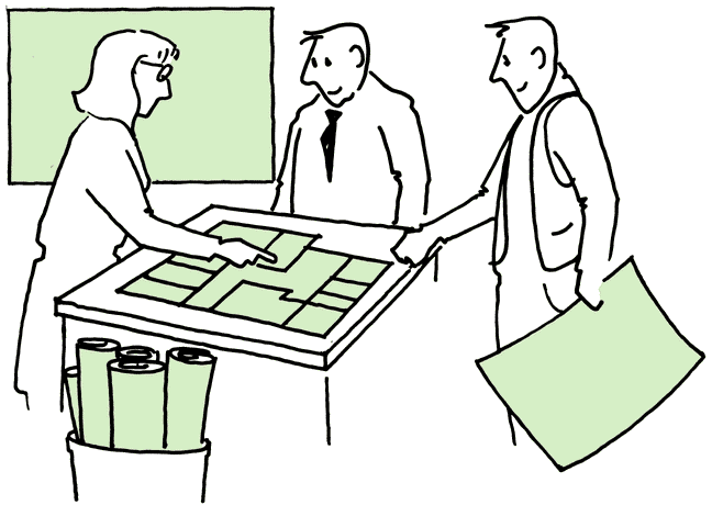 • representanter for eiere, helsepersonell og myndighetene. De vil delta i hele eller deler av prosessen fra programmeringsfase til ferdig resultat