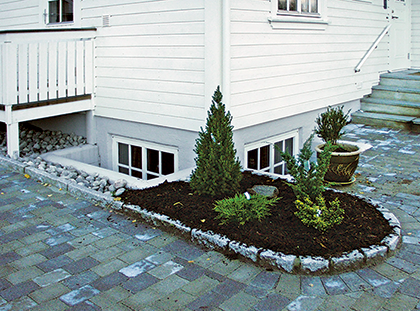 Lysgraver foran kjellervinduer kan sikres mot snubling med kantstein, rullestein og vegetasjon. Foto: SINTEF Byggforsk