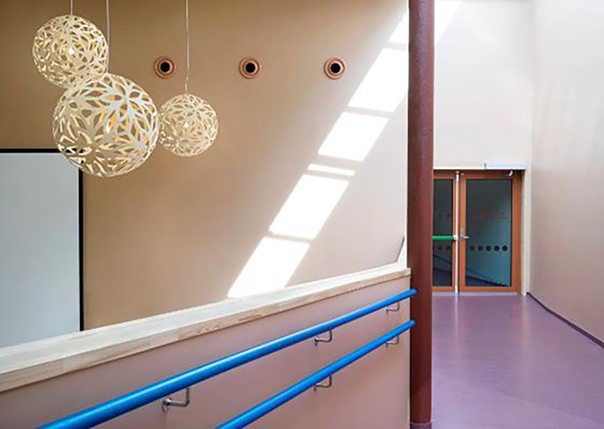 Både håndløper og søyle har god luminanskontrast til bakgrunnen. Hebekk Skole. Arkitekt: Planforum Arkitekter AS. Foto: Eli Haugen Sandnes