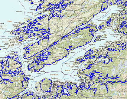 Kartutsnitt over marin grense i Trøndelag og Nordmøre [951]. Marin grense er markert med blått. Kart over løsmasser og marin grense for andre landsdeler og mer detaljerte kart over mindre områder kan lastes ned fra internettsiden til Norges geologiske undersøkelse.