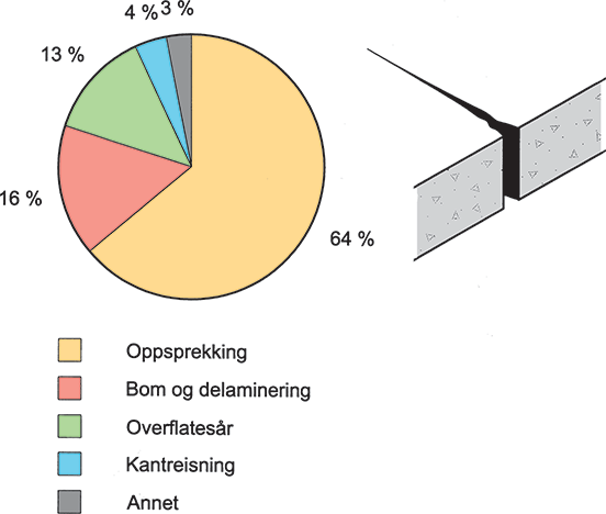 Skadene kan som regel føres tilbake til prosjektering og utførelse, eventuelt i kombinasjon med endrede bruksbetingelser, for eksempel endrede belastninger.