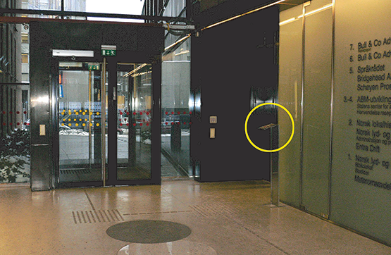 skilt med blindeskrift (se gul sirkel) og informasjonsskilt på veggen med bokstaver i tilfredsstillende størrelse. Se pkt. 82. Skiltene er trukket til side for hovedtrafikklinja og man kan lett komme helt inntil dem for å kunne lese.