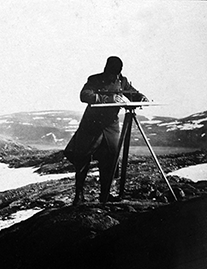 Kartlegging av norske landsdeler med grenser ble satt i gang på midten av 1800-tallet. For å fastsette grensepunkter ble det benyttet et såkalt målebord, som besto av en bordplate på stativ med et kikkertrør festet til en linjal. Nye/ukjente grensepunkter ble fastsatt ved hjelp av krysningslinjer mellom siktlinjer fra forskjellige kjente punkter. Øverste foto: Ukjent, nederste foto: Børth Aadne Sætrenes