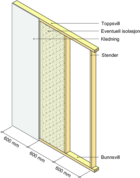 Prinsipiell oppbygning av innvendig veggkonstruksjon med bindingsverk av tre. Standard stenderavstand er c/c 600 mm, men også c/c 900 mm er aktuelt.
