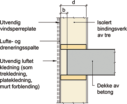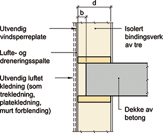 Prinsipiell oppbygning av tilslutning mellom vegger med isolert bindingsverk av tre med gjennomgående stendere, og dekke av betong