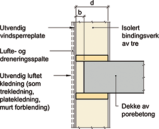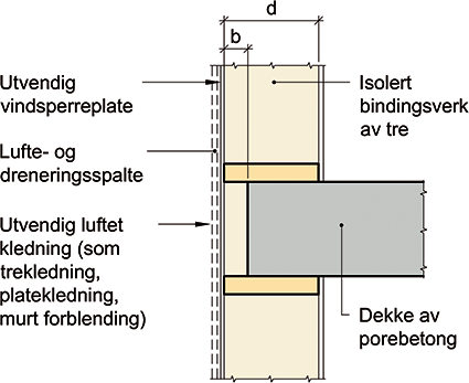 Prinsipiell oppbygning av tilslutning mellom vegger med isolert bindingsverk av tre med gjennomgående stendere, og dekke av porebetong