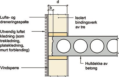 Prinsipiell oppbygning av tilslutning mellom vegger med isolert bindingsverk av tre med gjennomgående stendere, og hulldekke av betong