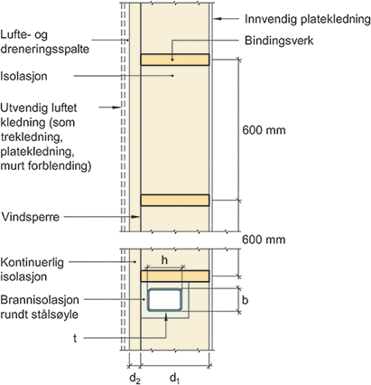 Denne anvisningen inneholder kuldebroverdier, ψ (W/(mK)), for tilslutning mellom vegger med isolert bindingsverk av tre med kontinuerlig utvendig isolasjon og søyle av stål, se fig. 01.