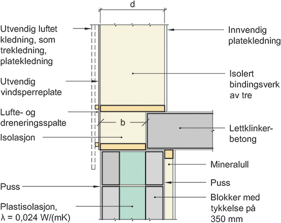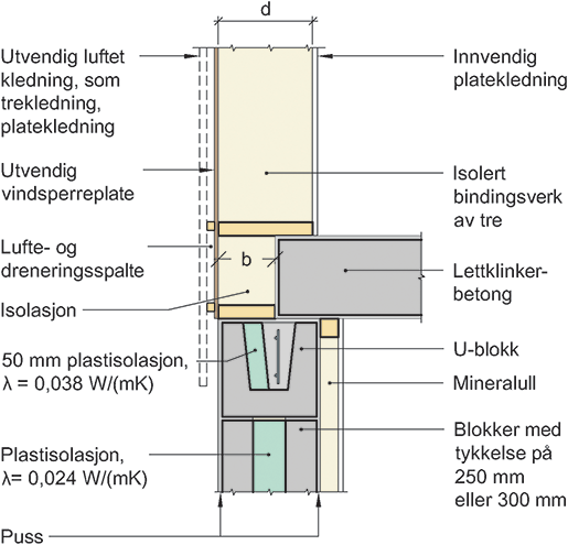 Prinsipiell oppbygning av tilslutning mellom murt vegg, bindingsverksvegg av tre og dekke av lettklinkerbetong