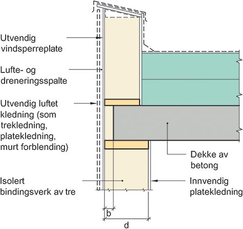 Prinsipiell oppbygning av tilslutning mellom kompakt tak på dekke av betong og bindingsverksvegg av tre