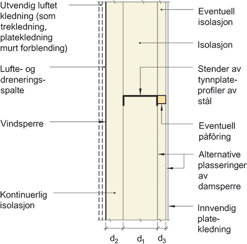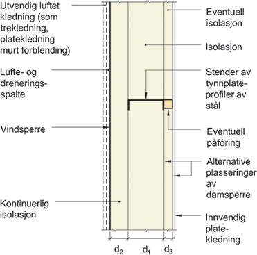 Prinsipiell oppbygning av vegg med isolert bindingsverk av stålprofiler med utvendig kontinuerlig isolasjon