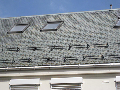 Snøfangere i to rader på store tak. Foto: SINTEF Byggforsk