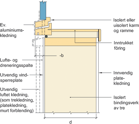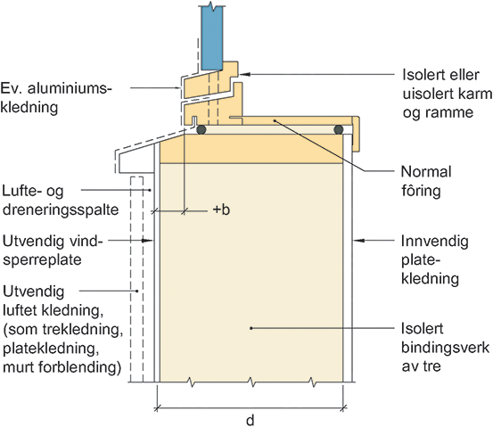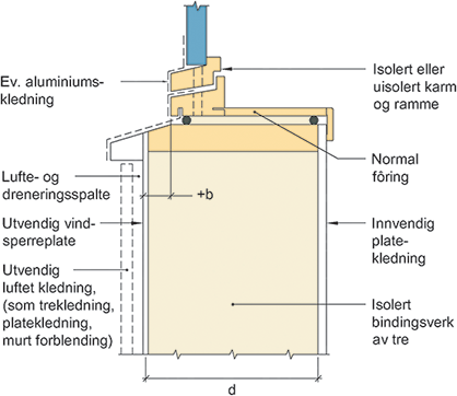 Prinsipiell oppbygning av tilslutning mellom vindu og bindingsverksvegg av tre. Vinduet er plassert på utsiden av vindsperra.