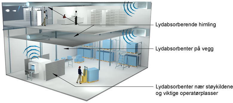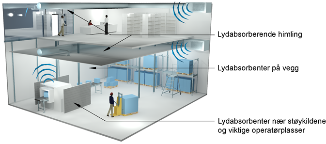 Lydabsorberende himling og lydabsorbenter på vegger er avgjørende for å oppnå god akustikk i produksjonslokaler og forretningslokaler. Det er også viktig med lydabsorbenter nær støykildene og sentrale operatørplasser.