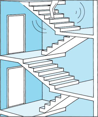 Dette bladet beskriver støydemping i trapperom og korridorer. Trapperom og korridorer er normalt rom med bare sterkt lydreflekterende overflater, der det er behov for absorbenter for å redusere etterklangstiden. Bladet viser eksempler på forskjellige absorpsjonsmaterialer og monteringsmåter. Det gir også metoder for å beregne etterklangstid.