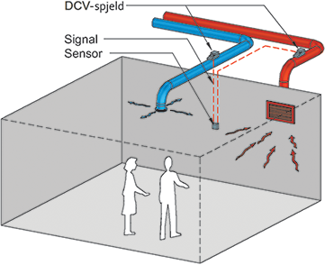 Behovsstyrt anlegg (DCV). En sensor måler luftas kvalitet i rommet og luftmengden reguleres ut fra målingen. For riktig funksjon må man stille krav til anlegget ved innkjøp og kontrollere at kravene er innfridd ved overlevering.