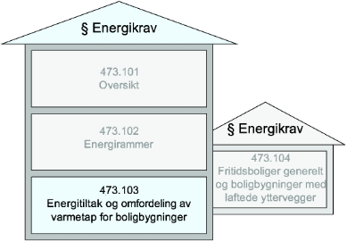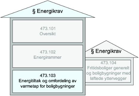 Oversikt over samtlige energikrav til bygninger og krav til energiforsyning er gitt i Byggdetaljer 473.101.