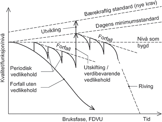 Forenklet skisse som viser utvikling av kvalitet eller standard avhengig av om bygningen vedlikeholdes