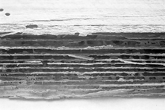 Øvre halvdel av bildet viser overflaten på trevirket, mens nedre halvdel viser et snitt av trevirket. Øverst til venstre er det to flygehull, og i snittet ser vi hvordan bare den harde høstveden står igjen etter borebillelarvenes måltid. Foto: Mycoteam as