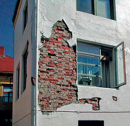 Eksempel på resultat av for sterk puss på svakt underlag. Frostskader på teglmurverket har oppstått etter at pussen har løsnet.