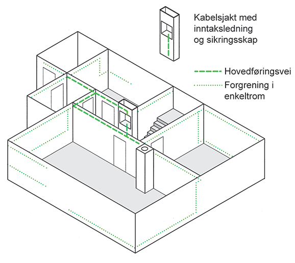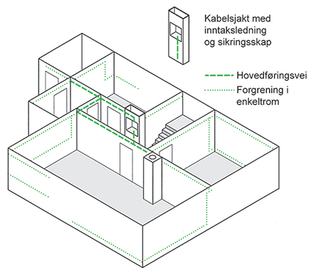 Kablene er samlet i én hovedføring, med avgrening fra ett sted i hvert rom. Hovedføringsveien bør legges slik at flest mulig rom i huset kan få uttak direkte fra denne.